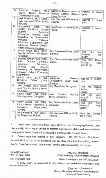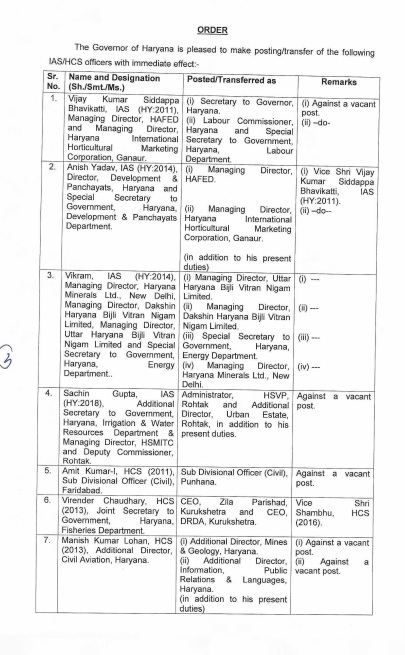 हरियाणा सरकार ने शुक्रवार को फिर प्रशासनिक फेरबरदल किया है। सरकार ने 4 आईएएस और 13 एचसीएस अधिकारियों के तबादले और नई नियुक्तियां कर दी हैं।