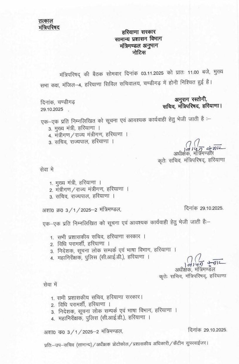 Cabinet Meeting : हरियाणा के मुख्यमंत्री नायब सिंह सैनी (CM Nayab Singh Saini) की अध्यक्षता में मंत्रिपरिषद की बैठक आगामी 3 नवम्बर, 2025 को सुबह 11 बजे चौथी मंजिल स्थित मुख्य सभा कक्ष हरियाणा सिविल सचिवालय, चंडीगढ़ में आयोजित होगी। इस मीटिंग में कई महत्वपूर्ण मुद्दों पर चर्चा होने की संभावना है।