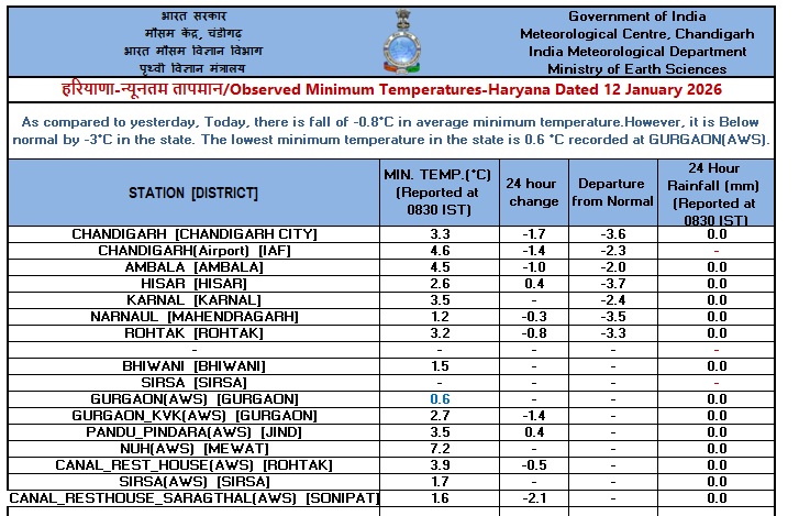 चौधरी चरण सिंह हरियाणा कृषि विश्वविद्यालय हिसार के कृषि मौसम विज्ञान विभाग के विभागाध्यक्ष डॉ मदन खीचड़ ने जानकारी देते हुए बताया कि हरियाणा राज्य में मौसम आमतौर पर 16 जनवरी तक शुष्क रहने की संभावना है। इस दौरान उत्तरपश्चिम शीत हवाएं चलने से रात्रि तापमान में हल्की गिरावट आने व दिन के तापमान में हल्की बढ़ोतरी होने की संभावना है। इस दौरान दक्षिण व पश्चिमी हरियाणा के जिलों में कहीं कहीं पाला पड़ने की भी संभावना है।