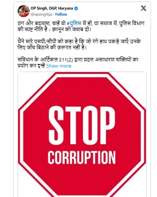डीजीपी ओपी सिंह ने सभी एसपी और सीपी को निर्देश दिए गए हैं कि जो भी आरोपी पुलिसकर्मी रंगे हाथ पकड़ा जाए, उसके खिलाफ अलग से जांच बैठाने की जरूरत नहीं है। संविधान के आर्टिकल 311(2) द्वारा प्रदत्त असाधारण शक्तियों का प्रयोग कर इन्हें नौकरी से बर्खास्त ही कर दें।