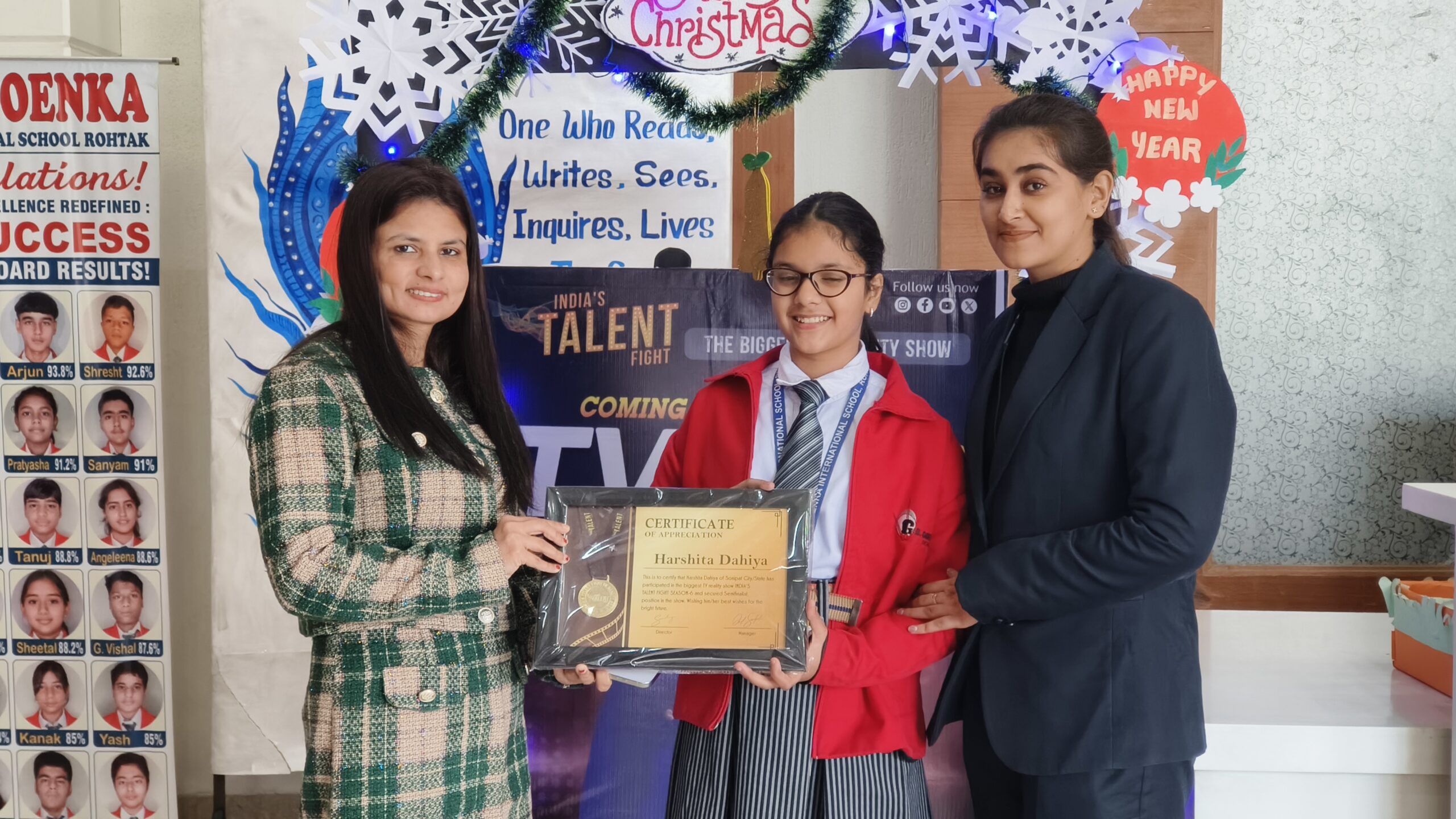 जी डी गोयनका इंटरनेशनल स्कूल, रोहतक की प्रतिभाशाली छात्रा हर्षिता दहिया ने लोकप्रिय टीवी टैलेंट शो इंडिया टैलेंट फाइट (ITF) में उत्कृष्ट प्रदर्शन करते हुए सेमी-फाइनल में प्रवेश कर विद्यालय, परिवार एवं क्षेत्र का नाम गौरवान्वित किया है।