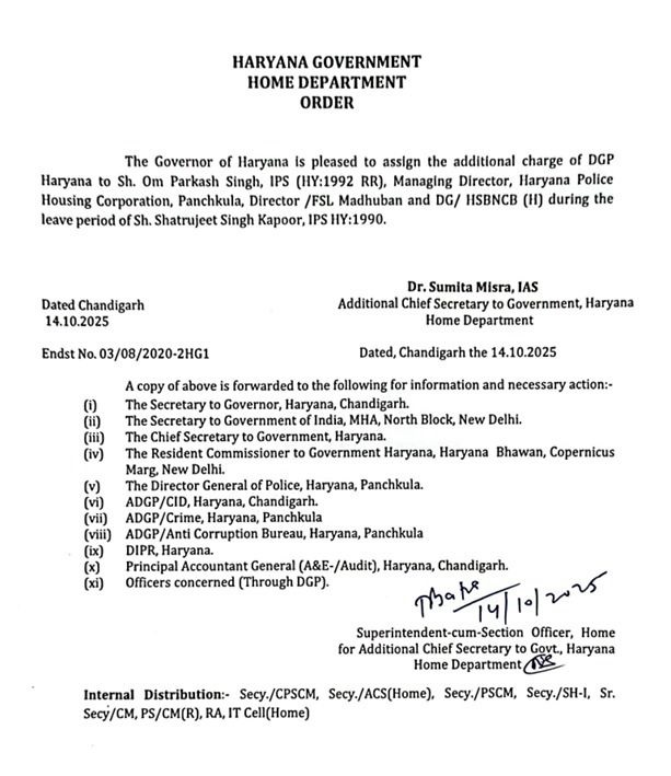 Haryana news : IPS वाई पूरन कुमार आत्महत्या के मामले में हरियाणा सरकार ने DGP शत्रुजीत कपूर को छुट्टी पर भेजा दिया है। वरिष्ठ IPS ओम प्रकाश सिंह (OP Singh) को DGP हरियाणा का अतिरिक्त प्रभार सौंपा गया है।