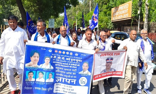 रोहतक : आईपीएस अधिकारी और एडीजीपी वाई. पूरन कुमार की आत्महत्या मामले ने सोमवार को रोहतक में बसपा कार्यकर्ताओं ने प्रदेश सचिव विनय बौद्ध के नेतृत्व व जिला अध्यक्ष हवा सिंह बौद्ध की अध्यक्षता में प्रदर्शन किया गया।