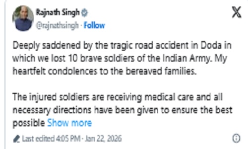 जम्मू कश्मीर के डोडा जिले में गुरुवार को बड़ा सड़क हादसा हो गया। सेना का एक बुलेट-प्रूफ वाहन अनियंत्रित होकर गहरी खाई में गिर गया। जिसमे करीब 10 जवान शहीद हो गए और सात जवान घायल हुए हैं। घायल जवानों को उधमपुर मिलिट्री हॉस्पिटल के लिए एयरलिफ्ट किया गया।
