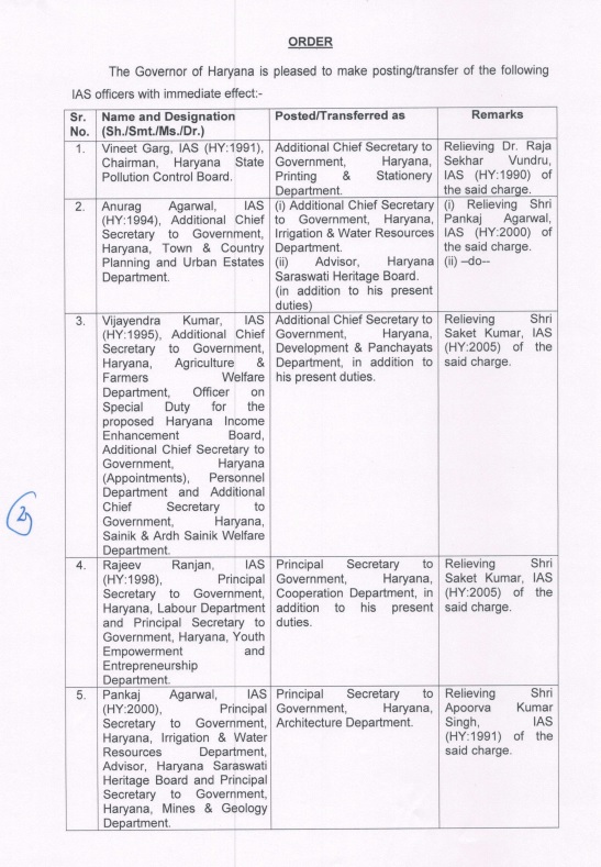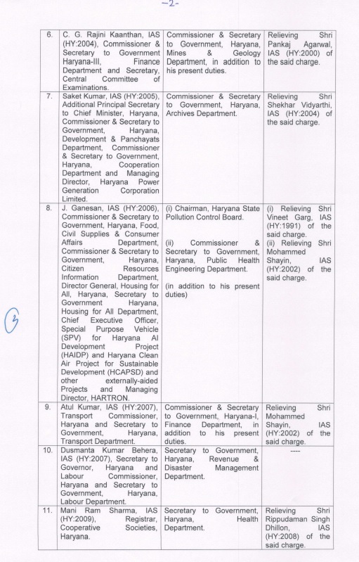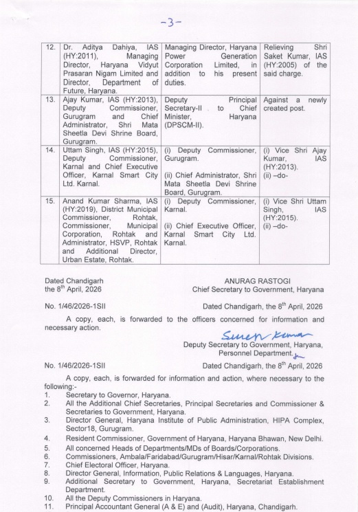 आनंद कुमार शर्मा को रोहतक के नगर निगम आयुक्त और HSVP प्रशासक के पद से हटाकर, करनाल का नया DC बनाया गया है। करनाल के उपायुक्त उत्तम सिंह को गुरुग्राम का उपायुक्त बनाया गया है।