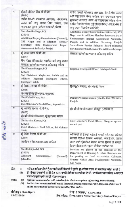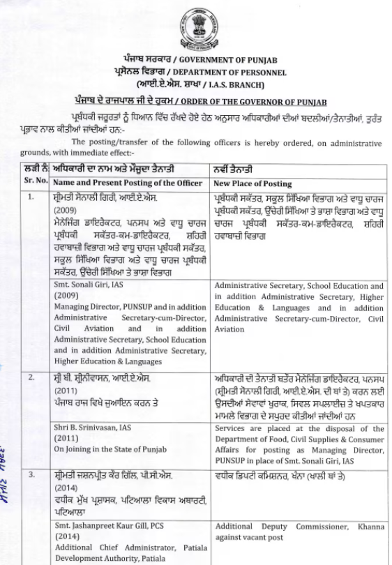 Punjab news: पंजाब सरकार के पर्सनल डिपार्टमेंट की तरफ से जारी ऑर्डर के मुताबिक, 2 IAS और 4 PCS अधिकारियों के ट्रांसफर/नई पोस्टिंग की गई है। एडमिनिस्ट्रेटिव कारणों से यह फैसला तुरंत लागू कर दिया गया है।